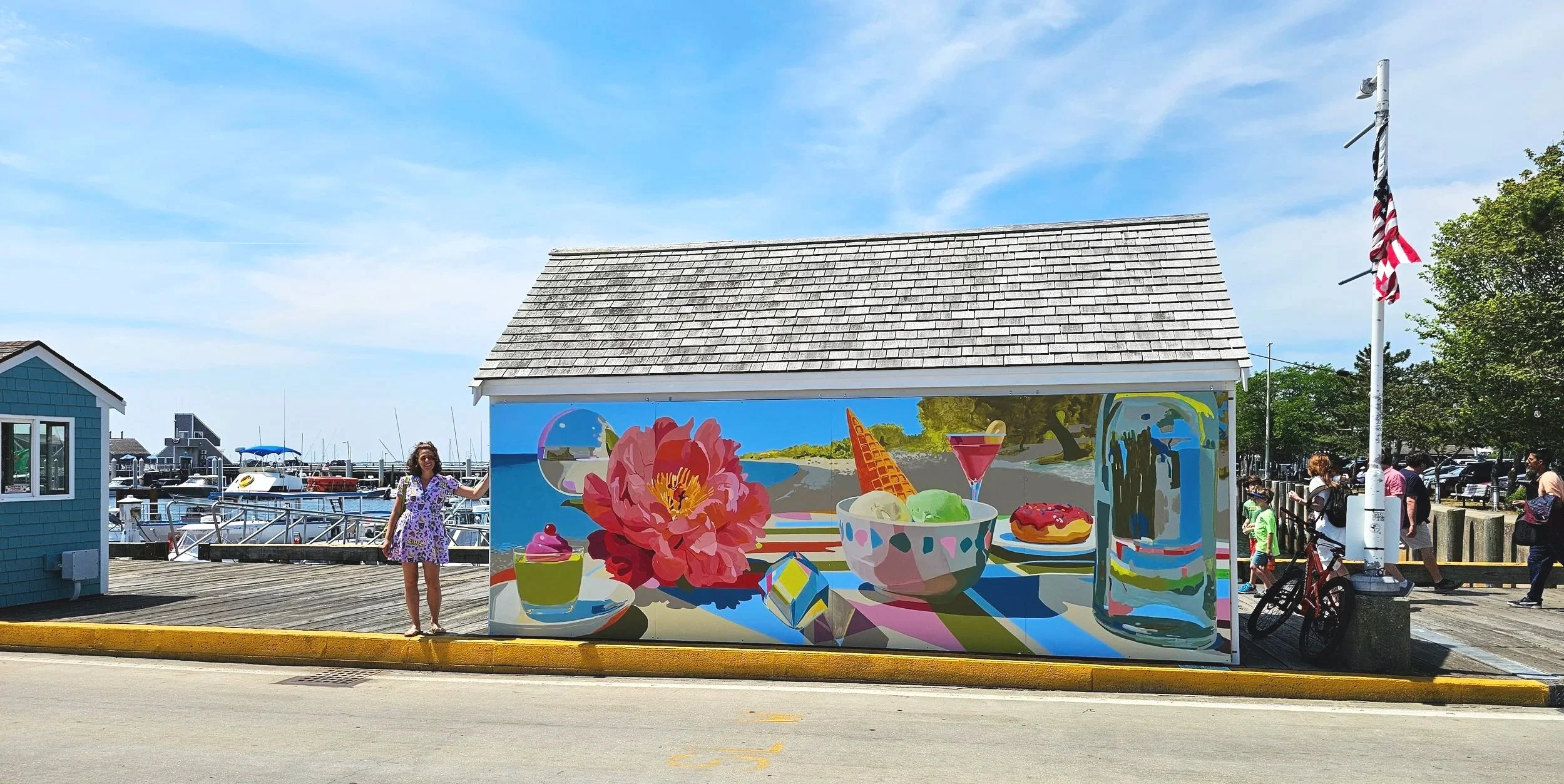 This mural is a joyful tribute to the indulgences of summer. Set against the backdrop of the beach, a playful still life unfolds across a patterned tablecloth: a pistachio-almond pudding topped with cherry and cream, a radiant peony, a bowl of ice cream, and a sugar-dusted donut. A gemstone catches the sunlight, a cocktail invites celebration, and a hovering bubble adds a note of magic. Together, these vibrant details capture the spirit of summer in Provincetown, inviting viewers to pause, enjoy a treat, and savor the moment. Listen to a special Spotify playlist inspired by the art.